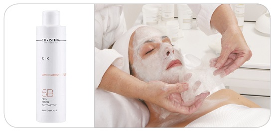 Косметолог наносить шар шовкових волокон поверх маски-бази, рівномірно розподіляючи. Після цього невеликими порціями додає активатор одночасно масажуючи до повного розчинення волокон. Шовкові протеїни зволожують шкіру, а активатор, що використовується для їх розчинення, зміцнює і відновлює шкіру, в результаті вона ущільнюється і виглядає молодшою. Необхідну кількість шовкових волокон розділити руками на кілька невеликих частин і акуратно викласти на маску-базу. Зверху віяловим пензлем нанесіть. тонким шаром активатора. І масажуйте легкими рухами до повного розчинення волокон. Шовкові волокна миттєво розчиняються в активаторі (як солодка вата під дощем). Однорідну мутнувату суміш, що утворилася, розподіляйте по всьому обличчю. Після того, як розподілили суміш, переходьте до наступного кроку.