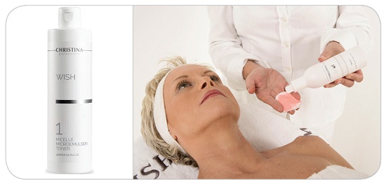 Перший крок салонної процедури Wish – очищення шкіри обличчя та шиї від макіяжу та інших забруднень. Мікроемульсійним тоніком з міцеллою косметолог дбайливо очищає вашу шкіру, одночасно зволожуючи та тонізуючи її. Попередньо обробивши обличчя очищуючим засобом Wish Facial Wash, за допомогою ватного диска рухами, що поплескують, нанести тонік на шкіру обличчя і шиї.