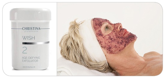 Після очищення шкіри косметолог тонким рівномірним шаром, уникаючи шкіри навколо очей, накладає на обличчя і шию клієнта противіковий ексфоліатор. Препарат має зігрівальну дію, завдяки чому покращується харчування шкіри, клітини епідермісу насичуються киснем. На другому етапі процедури Wish забезпечується ефективна ексфоліація шкіри. Помітно зменшуються почервоніння. Нанести тонким шаром, уникаючи області навколо очей. Залишити на 2-4 хвилини, змити водою.