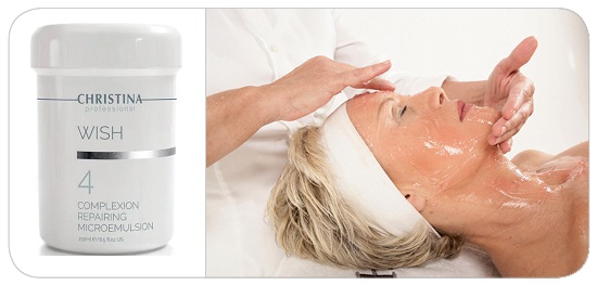 Четвертим кроком салонної процедури Wish є нанесення мікроемульсії для комплексного відновлення шкіри. Бережними рухами тонким рівномірним шаром косметолог завдає препарат на зону обличчя, шиї та декольте. На даному етапі рекомендується протягом 5-10 хвилин зробити легкий масаж, щоб активізувати проникнення активних інгредієнтів у найглибші шари клітин шкіри. Зволожена та насичена активними речовинами, шкіра помітно вирівнюється та набуває здорового зовнішнього вигляду.. Нанести на шкіру та зробити легкий масаж протягом 2-4 хвилин, постійно зволожуючи пальці рук. Техніка масажу вибирається індивідуально кожному за клієнта. Під час масажу шкіра активно зволожується, підвищується її тонус. Не змивати!