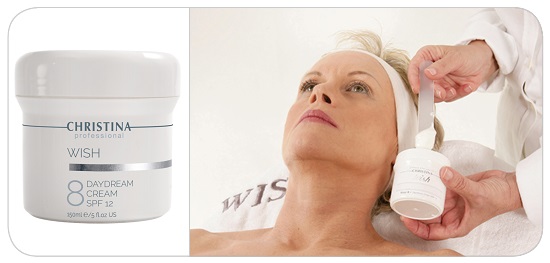 Завершальний кроком салонної процедури Wish є нанесення денного крему з фактором захисту від сонячних променів - SPF 12. Препарат наноситься тонким рівномірним шаром поверх сироватки на область обличчя та шиї. Завдяки активним компонентам, що входять до складу денного крему, шкіра омолоджується стає більш пружною. Препарат захищає шкіру від шкідливого впливу довкілля. Нанести на шкіру рухами, що поплескують.